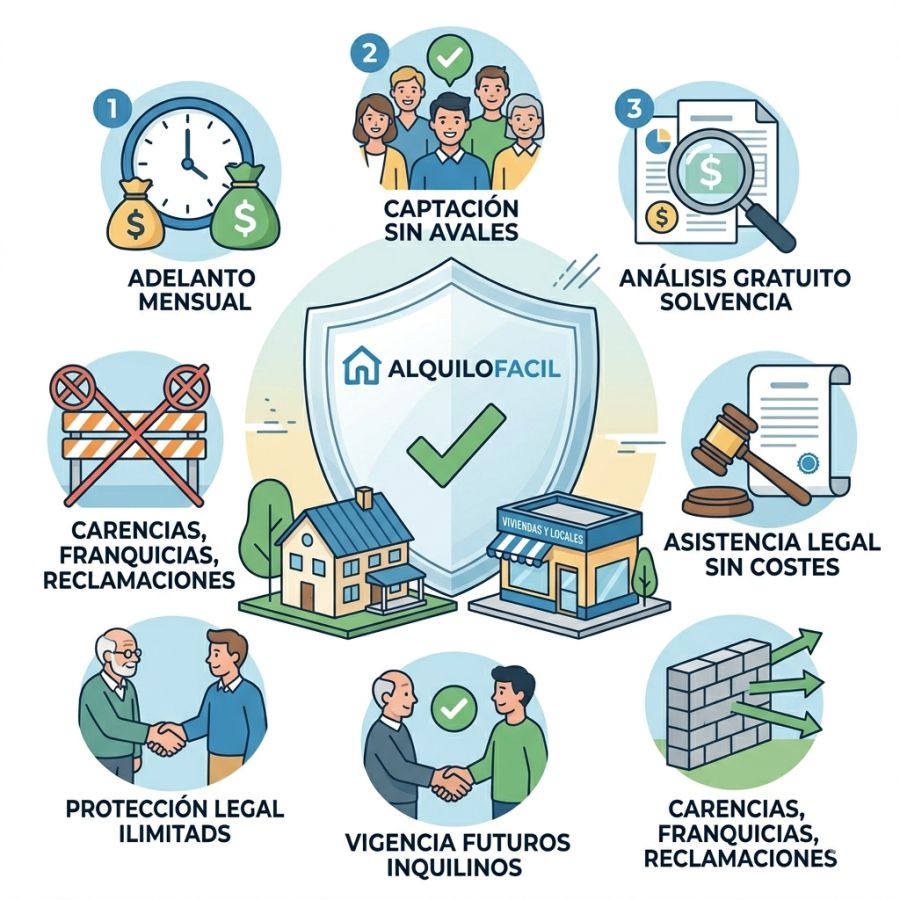 Alquilofacil además dispone de servicios exclusivos para todos nuestros propietarios en Seguros de Impago, colaborando con las principales compañías a nivel nacional para garantizar el cobro de las rentas cada mes, cubriendo además los gastos de, Abogados, Procuradores, gastos Judiciales y hasta 5.000 euros en daños por actos vandálicos.